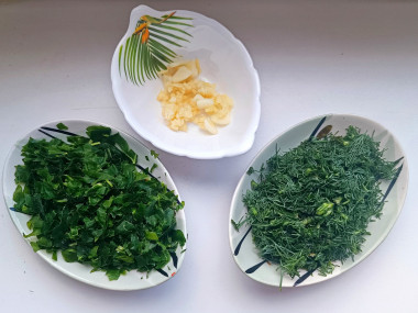 Чеснок очистить и мелко порубить. Укроп и кинзу вымыть, обсушить и мелко порубить.