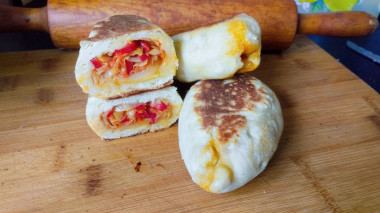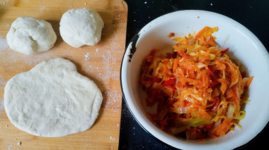 Тесто быстро и просто замешивается, жарка тоже происходит довольно просто. У меня начинка была с капустой и овощами, сок вытек и швы разошлись, так что начинку стоит откинуть на дуршлаг, если она сочная, чтобы такого не произошло.