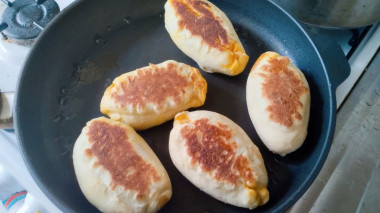 Затем пирожки переверните и дайте им зарумяниться с другой стороны. Накройте сковороду крышкой и подержите пирожки на огне еще около 5-7 минут, чтобы они хорошо прожарились внутри, тесто не должно остаться влажным.
