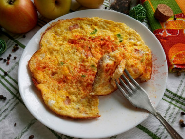 Недавно видела фотоотчет на этот рецепт и подумала, почему бы и мне не попробовать приготовить омлет с беконом. Я раньше только обычный бекон использовала, но в тонкой нарезке даже интереснее) А сочетание бекона с яйцами оказалось очень аппетитным. Я сделала себе одну порцию на два яйца, мне хватило маленькой сковородки для этого. В омлетную массу дополнительно добавила немного зеленого лука для цвета и вкуса. А готовый омлет присыпала копченой паприкой, она и цвет яркий дает и вкус блюда становится более пряным. Кстати бекон у меня был сырокопченый, соленый, поэтому омлет я не солила. У меня получился отличный солнечный завтрак. Омлет с беконом просто сказка, очень вкусно! Сам омлет имеет нежную структуру и сливочный вкус, а у бекона и специй яркий насыщенный вкус. Сочетание необычное и поразительно вкусное. Мне очень понравилось, спасибо за рецепт!