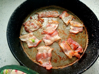 В сковороде раскалите растительное масло. Выложите бекон. Если у вас он жирный, масла можете либо вообще не использовать, либо сократить его количество. Обжарьте с двух сторон до румяной корочки примерно по 2 минуты с каждой стороны.