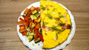 Омлет с беконом - шикарный, сытный завтрак. Сначала обжарила бекон на сухой сковороде, потом добавила размешанные вилкой яйца и накрыла крышкой. Пока омлет готовился, сделала овощной салат. Просто, вкусно, быстро. Что еще нужно для хорошего начала рабочего дня. Яркий, как солнышко, омлет с хрустящими ломтиками бекона и салатом из спелых, сочных, ароматных овощей – заряд позитива на весь день. Готовьте с удовольствием.