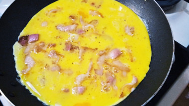 Вылейте в бекон яично-молочную смесь. Жарьте омлет на небольшом огне под крышкой около 8 минут.