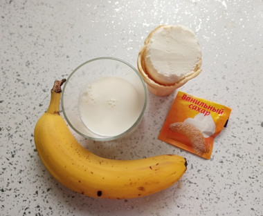 В чашу блендера выложите кусочки банана, мороженое, влейте охлажденное молоко, всыпьте ванильный сахар. Ванильный сахар можно заменить на ванилин. Как правильно это сделать читайте в отдельной статье по ссылке после рецепта.