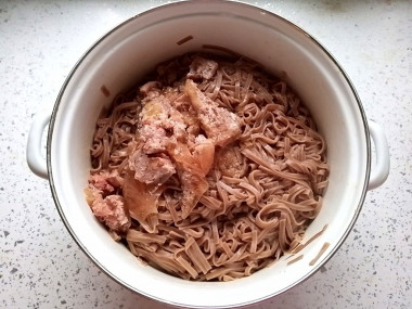 Мне нужно было приготовить что-то на ужин, но быстро. Выручил рецепт лапши с тушенкой. Отличный вариант: быстро, сытно и вкусно! Лапша у меня была гречневая, отварила ее и откинула на дуршлаг. Тушенка говяжья, разрезала содержимое банки на кусочки и отправила к лапше. За счёт горячей температуры желе от тушенки быстро растаяло и само мясо прогрелось. Вместо кетчупа добавила томатную пасту. Получилось все быстро и вся семья сытая. Особенно мне нравится как соус от тушенки пропитывает макароны!