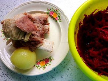 Как сварить горячий борщ из маринованной свеклы? Подготовьте ингредиенты для приготовления супа. Говядину лучше возьмите на кости, с небольшим количеством жирка, так борщ получится наваристее и вкуснее.