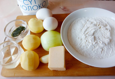 Сложите лук, очищенный зубчик чеснока и картофель в блендер. Добавьте немного молока из общего количества, чтобы было легче измельчать. Все хорошенько взбейте до однородности.
