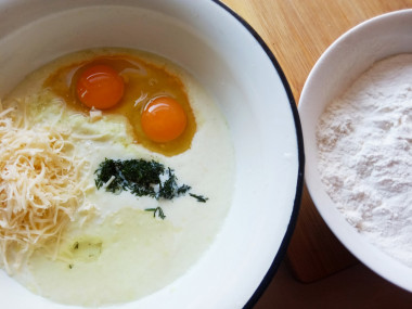 Твердый сыр натрите на средней терке прямо в тесто. Сыр берите любой, главное чтобы он был свежий, вкусный и без добавления растительных жиров. Зелень вымойте в проточной воде, обсушите, мелко нарежьте и добавьте в тесто. Зелень можно брать любую на ваш вкус, у меня укроп.