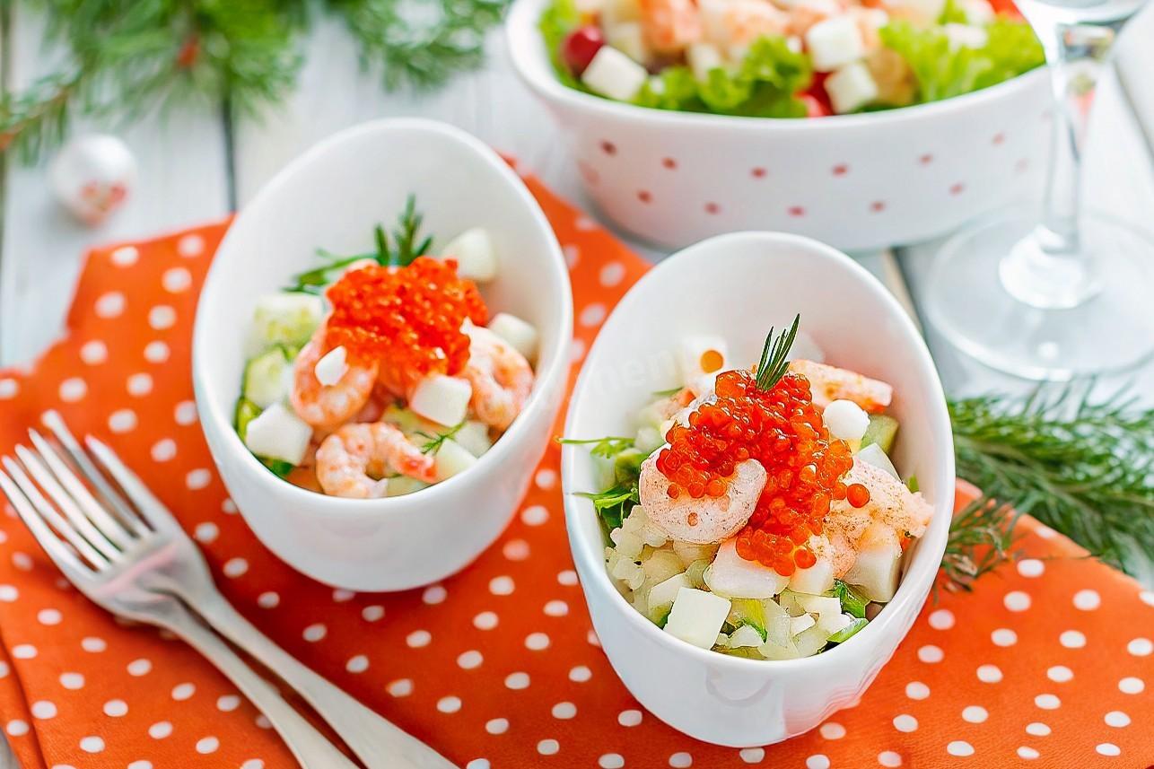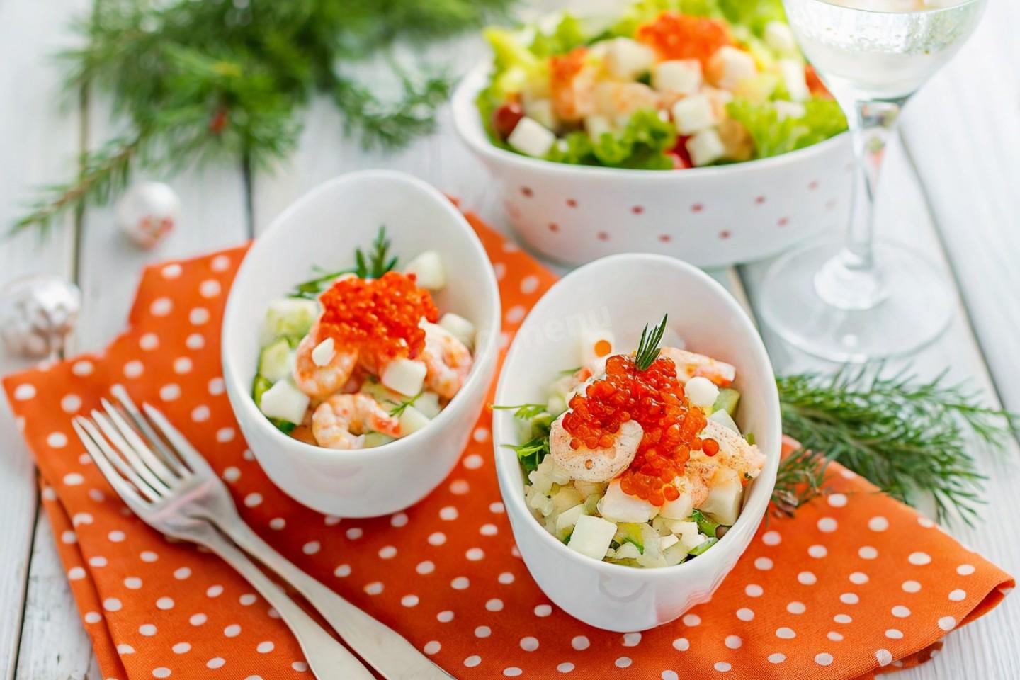 В салат добавьте майонез, всё перемешайте. А как сделать домашний майонез, читайте по ссылке в конце рецепта.Красную икру в не заправленный салат лучше не добавлять, иначе при перемешивании икринки могут полопаться. Её можно добавить в каждую порцию салата, украсить ею салат или приготовить салат в порционных креманках, а сверху выложит икру.