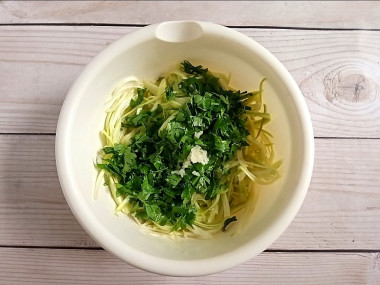 Выложите получившиеся "спагетти" из кабачка в миску и залейте заправкой. Перемешайте и оставьте кабачки на 10 минут мариноваться.