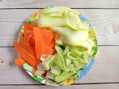 Кабачок помойте, отрежьте кончики. Очистите его от кожуры. Нарежьте очищенный кабачок на пластины при помощи овощечистки. А затем полученные пластины — на длинные тонкие полоски. Серединку, с семенами, оставьте, не нарезайте — она будет грубовата.