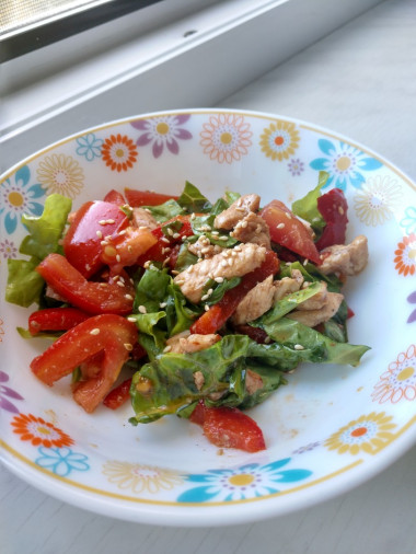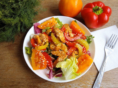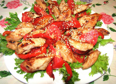 Теплый салат с курицей, помидорами и перцем - простой, быстрый, вкусный! Особенно хорошо маринованная обжаренная куриная грудка с кунжутом и свежим овощами. Практически полноценное блюдо. Спасибо!
