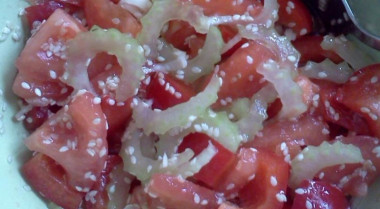 Сверху полейте салат оставшимся растительным маслом и посыпьте кунжутом. Дополнительно солить салат не обязательно - соевый соус отлично справляется с этой задачей. Сразу же подайте теплый салат к столу. Приятного аппетита!