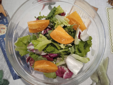 Листья салата промойте и обсушите. У меня салатная смесь состоит из рукколы с радиччо. По желанию готовую салатную смесь можете заменить на салат какого-то одного вида или пекинскую капусту.