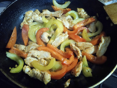 В сковороду к курице выложите болгарский перец и обжарьте все вместе, помешивая, на среднем огне еще 3-5 минут.