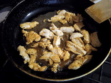В сковороде на сильном огне разогрейте одну столовую ложку растительного масла. Выложите курицу вместе с маринадом и обжарьте, помешивая, 5 минут.