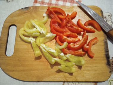 Болгарский перец очистите от семян и плодоножки и нарежьте соломкой.