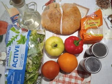 Как сделать теплый салат с курицей, перцем и помидорами? Очень просто. Для начала подготовьте необходимые ингредиенты по списку. Помидоры можете использовать любые, обычные сливовидные или черри. Овощную часть можете дополнять или заменять по своему вкусу. Такой салат можно приготовить также из мякоти индейки, свинины или говядины.