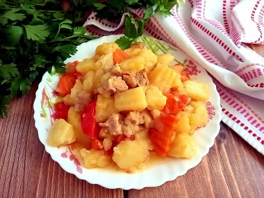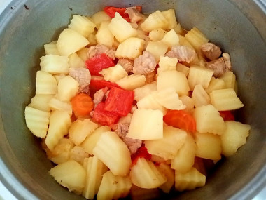 Зажарку я сделала из свинины, лука, моркови и чеснока. Все обжарила до румяности, аромат при этом потрясающий! Перец у меня красный, сочный, с толстыми стенками. Нарезала его крупными кусочками. Из специй взяла паприку, черный перец и овощную приправу. Листочек лаврушки завершил букет ароматов. Тушила все вместе минут 40. Сначала казалось, что жидкости мало, но помидоры дали сок и бульончика получилось довольно много. Отличное жаркое! Рекомендую!
