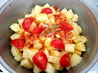 Картофель добавьте в казан. Если используются крупные клубни, то каждую картофелину нарежьте примерно равными частями. Помидоры залейте кипятком, подержите две- три минуты, воду слейте. Снимите кожуру с томатов и нарежьте их равными дольками. (можно на 4 части или на 6 частей). Отправьте так же к картофелю. Каждую дольку чеснока нарежьте на 4 части, добавьте ко всем ингредиентам. Посолите, поперчите. Добавьте любимые приправы и лавровый лист.