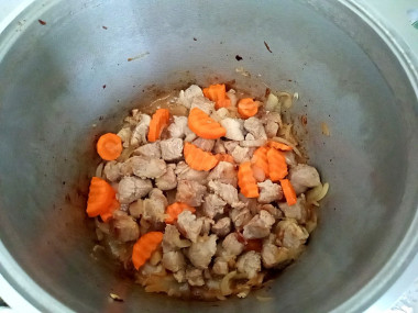 Отправьте в казан мясо и обжаривайте на сильном огне в течение 10-15 минут, пока каждый кусочек не зарумянится. Не забывайте периодически помешивать, чтоб мясо не пригорело.