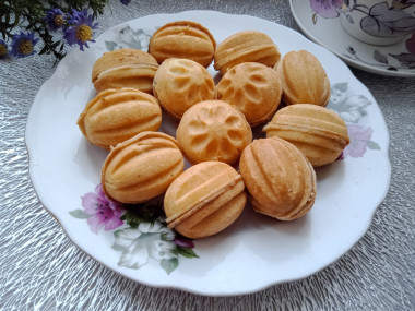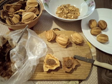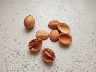 Форма у меня сразу и с орешками, и с грибочками, и с шариком - советская) Остывшие половинки орешков наполнила вареной сгущёнкой и соединила. Острым ножом обрезала края. Как пишет автор, так и готовила)))