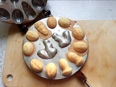 Выложите тесто в форму и готовьте печенье на газу с двух сторон, периодически переворачивая форму к огню то одной стороной, то другой. Готовые скорлупки выкладывайте в чашу для остывания. Следите, чтобы орешки у вас не подгорали.
