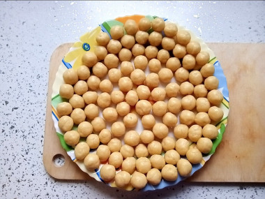 От готового теста отщипывайте небольшие шарики, размером чуть меньше грецкого ореха. Лучше всего накатать сразу много шариков, а потом только начинать их печь. Главное, чтобы в форму сразу выкладывать готовое количество шариков.