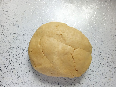 Масло разделите в чаше на кусочки с помощью вилки, добавьте соду и постепенно подсыпайте муку. Вначале удобно тесто замешивать с помощью деревянной лопатки.