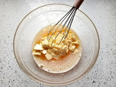 Затем добавьте в нее мягкое сливочное масло. О мягкости масла необходимо позаботиться заранее. Накануне с вечера вытащите масло из холодильника и оставьте на кухонном столе при комнатной температуре.