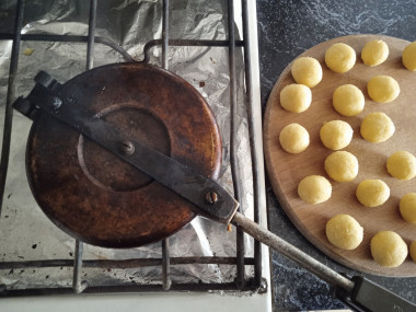 Далее вам понадобится специальная форма для приготовления ореховых скорлупок на газу. Разогрейте её хорошенько. Я ставлю форму греться перед тем, как начинать замешивать тесто. Она очень толстая и для ее разогрева необходимо достаточное количество времени. Не смотря на то, что в тесте достаточно масла, перед первой порцией хорошо смажьте форму растительным маслом. Выложите шарики теста в одну из половинок и прижмите второй.