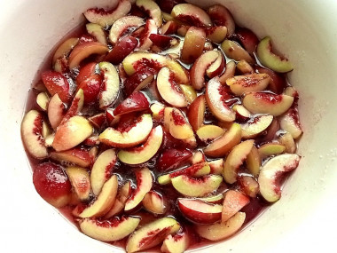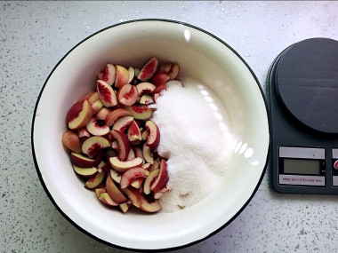 Засыпьте нектарины сахаром и потрясите, чтобы сахар равномерно распределился между кусочками нектаринов. Накройте тазик крышкой или пищевой пленкой и оставьте на несколько часов, чтобы нектарины пустили сок. Я обычно нарезаю с вечера и оставляю их стоять всю ночь.
