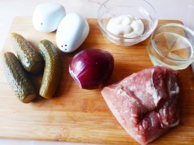 Как сделать салат с жареным мясом? Подготовьте все необходимые продукты. Мясо лучше брать свежее, замороженное предварительно разморозьте. О всех тонкостях разморозки читайте в отдельной статье по ссылке в конце рецепта. Свинина должна быть без прожилок, без костей, без жира,подойдёт окорок или вырезка. Можно взять отварное мясо и потом его обжарить. Лук лучше использовать красный салатный, у него мягче вкус.