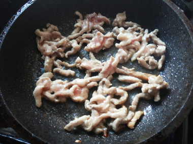 Мясо промойте, обсушите бумажным полотенцем и нарежьте соломкой. На сильном огне в сковороде разогрейте растительное масло. О том, как выбрать сковороду, а также подобрать масло, вы узнаете из статей по ссылкам в конце рецепта. Обжарьте мясо до готовности. Если свинина в один слой на сковороде не помещается, то обжаривайте в два приёма. На этом шаге можно добавить немного и чёрный молотый перец. Выложите мясо на бумажные салфетки и дайте ему остыть.