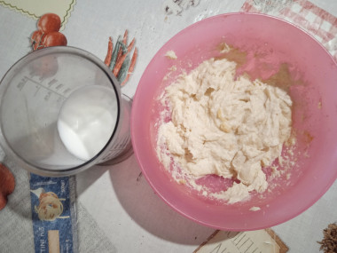Затем добавьте в фарш размоченный хлеб вместе с остатками молока. Предварительно тщательно разомните его руками. Влейте в миску остывший соус бешамель.