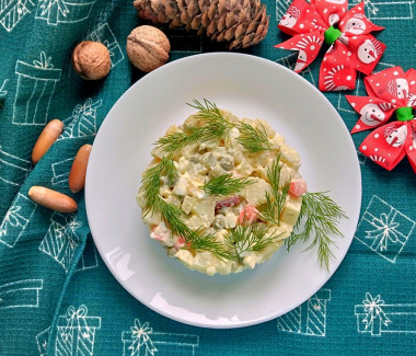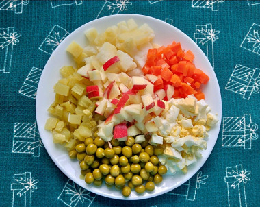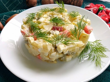 Можно также положить кальмары, если пост разрешает морепродукты. Но, думаю, вкус уже будет несколько другой, не совсем похожий на традиционный новогодний салат.