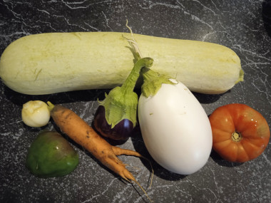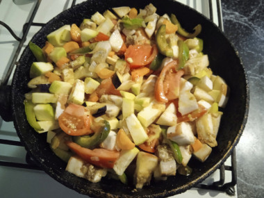 Решила приготовить на ужин лёгкое овощное блюдо. Понравился мне рецепт "тушеные овощи с баклажанами и кабачками". Имея все продукты под рукой, я легко сделала вкуснейшее блюдо. Баклажан использовала белый. Почистила овощи и нарезала по описанию в рецепте. Сначала пожарила лук на масле без запаха. Положила все остальные овощи, потушила. Овощи выделили много сока, поэтому воду я не добавляла. Из специй положила только соль и перец. Потушила до готовности. А в конце по рекомендации автора положила чеснок. Аромат стоял восхитительный. Эта чесночная нотка придала тушеным овощам и остринки, и аромата, и вкуса, и пикантности.