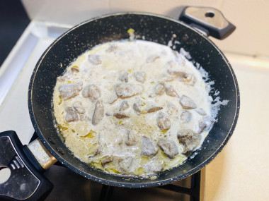 Нагрев убавьте, чтобы сковорода не была слишком горячей. Тогда сметана не свернется при последующем нагревании. Вылейте на сковороду сметану, разведенную с мукой, перемешайте. Доведите печень до кипения.