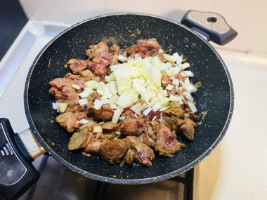 На сковороде слегка разогрейте растительное масло. Обжарьте репчатый лук, периодически помешивая, до полуготовности. Лук должен стать почти мягким.