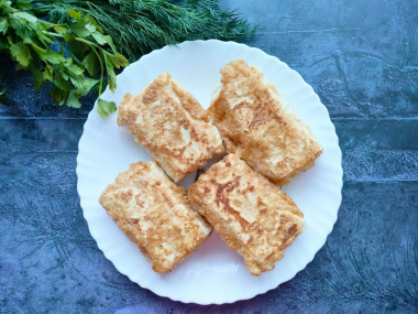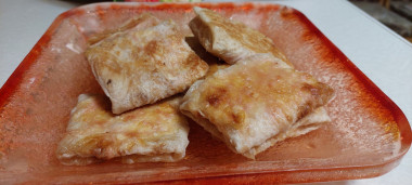 Обжаривайте лаваш с начинкой с двух сторон на среднем огне до румяной корочки. Готовые квадратики выложите на тарелку с салфеткой, чтобы впитался лишний жир.