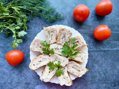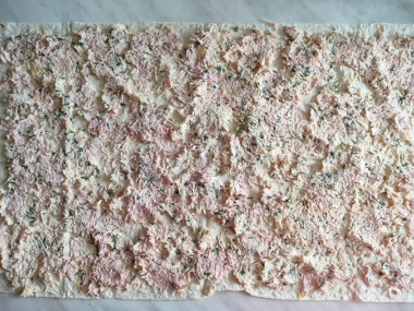 Лист лаваша расстелите на столе. По краю листа полосой выложите начинку (жалеть начинку не стоит) и сверните лаваш рулетом, чтобы начинка оставалась внутри. Нарежьте рулет из лаваша на порционные кусочки, размер которых сами выбираете по своему вкусу. У меня были квадратики 6 х 6 см.