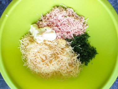 Колбасу и сыр натрите на крупной тёрке и выложите в глубокую миску. Свежую зелень укропа промойте и обсушите. Мелко нарежьте укроп и отправьте его в миску к колбасе с сыром. Туда же добавьте майонез и всё тщательно перемешайте. При желании можно немного присолить.
