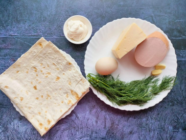 Как пожарить лаваш с колбасой и сыром на сковороде? Подготовьте необходимые продуты. Вместо варёной колбасы можно взять сосиски. Сыр подойдёт любой, у меня твёрдый, но можно взять и мягкий и полутвёрдый. На всякий случай подготовьте два яйца, одного может не хватить. Это зависит от того, на сколько обильно будет обмакиваться в яйцо лаваш перед жаркой. Из зелени я взяла укроп, но можно использовать любую, какая нравится.