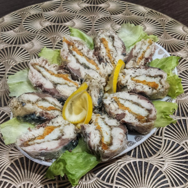 Рулет царский из скумбрии -шикарное блюдо по красоте, по вкусу! Рулет полностью оправдывает своё название! Готовится совсем несложно, а результат потрясающий! Скумбрию я разделала на два филе,посолила,добавила специи для рыбы и желатин. Для начинки я использовала яйца, морковь и лук.