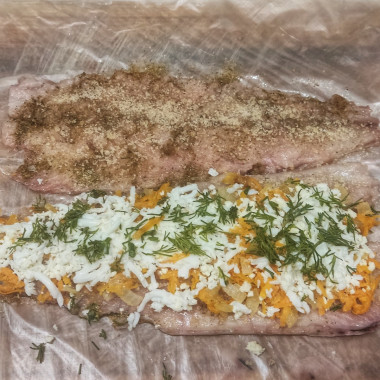 Далее начнем раскладывать начинку. Первым слоем выложите остывшую зажарку из лука и моркови. Распределите начинку по рыбе, оставляя по паре сантиметров свободного края с обеих сторон.