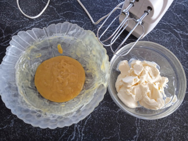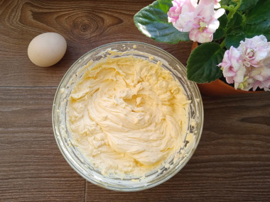 Выложите масло в глубокую миску и начните взбивать мягкое сливочное масло с помощью миксера, постепенно добавляйте к нему остывшую заварную основу. Взбивайте все вместе до получения крема однородной консистенции.