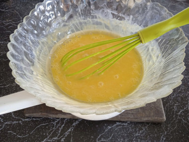 Отмерьте необходимое количество молока. Добавьте его в кастрюлю с яичной смесью. Перемешайте венчиком.