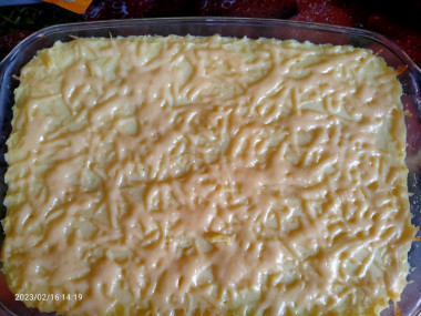 Я такую запеканку делаю немного по другому: отвариваю мясо, потом прокручиваю его через мясорубку и обжариваю на сковороде с луком, тогда она получается не такая жирная.