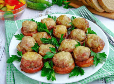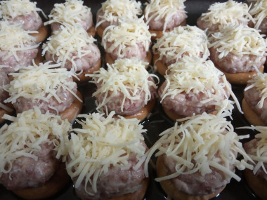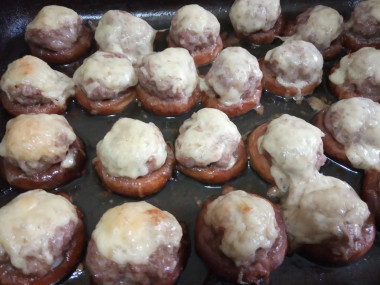 Заполните сушки фаршем. Я скатывала из фарша небольшие ровные шарики. Поставьте форму в разогретую до 180°С духовку на 15 минут. Если у вас есть режим "верх+низ", используйте его.