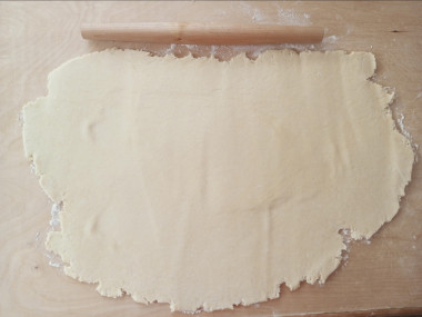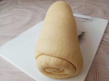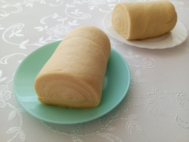 Охлажденное тесто раскатайте на присыпанном мукой столе в лепешку толщиной 5 мм. Сверните тесто плотным рулетом. Для удобства разрежьте рулет на 2 части. Тесто готово. Я сделала из него вкусные слойки с повидлом и пиццу. Приятного аппетита!